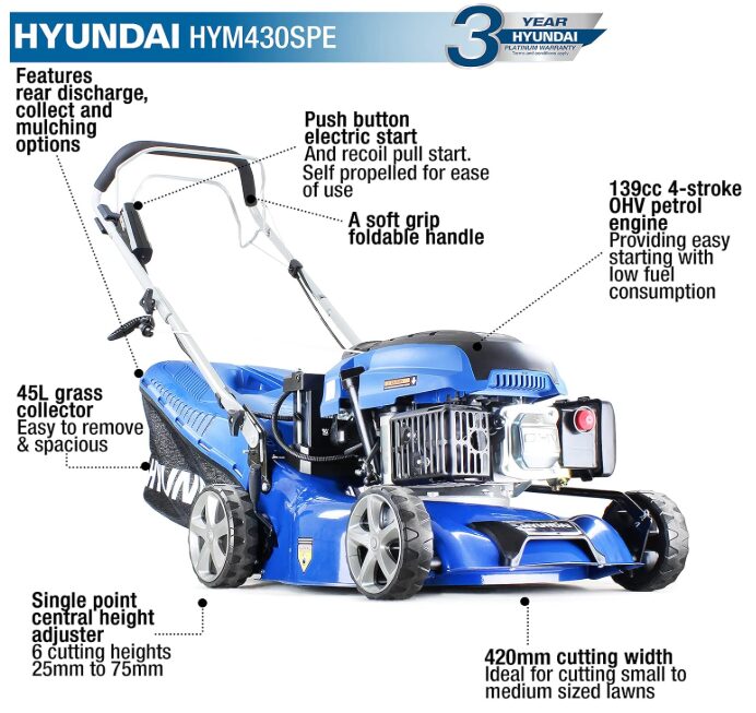 #2, Hyundai 17" 42cm 139cc Electric-Start Self-Propelled Petrol Lawnmower