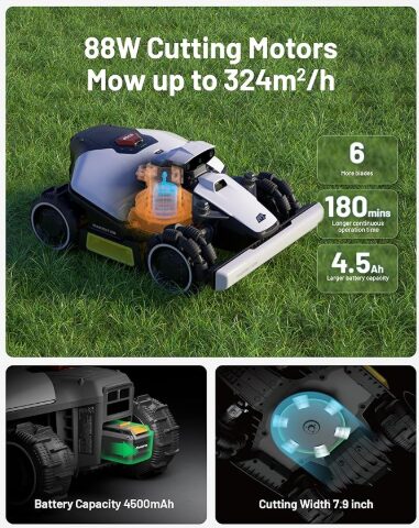 The secret sauce here is its UltraSense AI Vision. No boundary wires are necessary, there is no need for days of fiddling with mapping, and it can automatically identify grass vs not-grass, so it won't be cruising through your flowers or taking a spin down the driveway. Building virtual boundaries by itself, even in places where other robots lose GPS signal, like under trees or in tight corners, the device identifies obstacles while avoiding pets, kids, furniture, and even your gnomes, at the same time mowing right to the edge with precision below 5 cm.