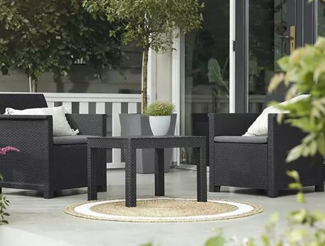 The matching resin coffee table completes the trio, ideal for drinks, snacks or that one plant you bought during a moment of botanical optimism. Lightweight, user-friendly and backed by a 3-year manufacturer guarantee, this set is built for both style and longevity.