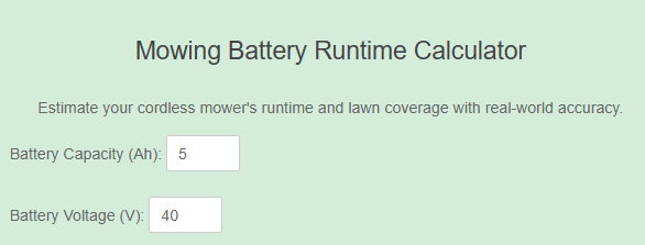 Estimate your cordless mower's runtime and lawn coverage with real-world accuracy.